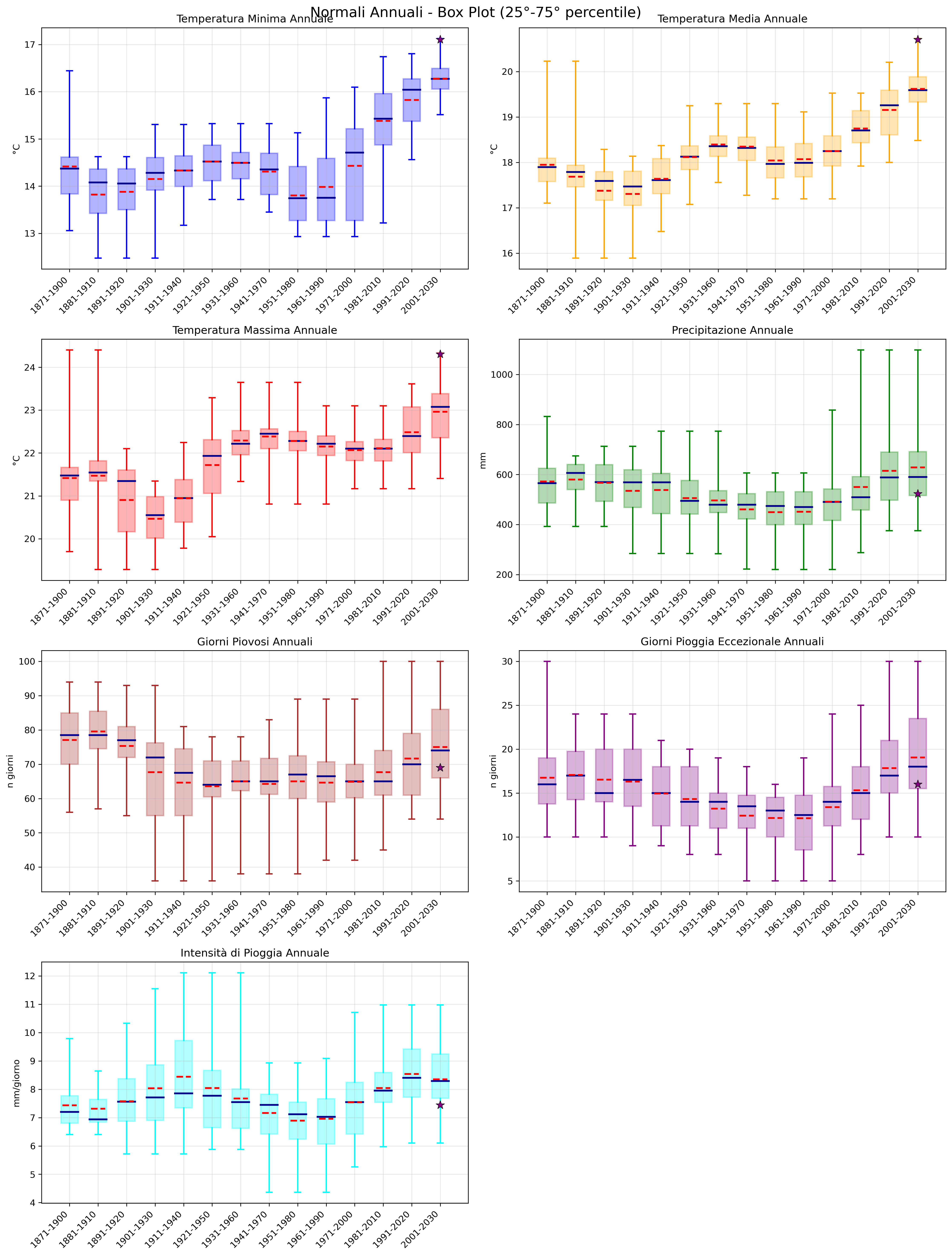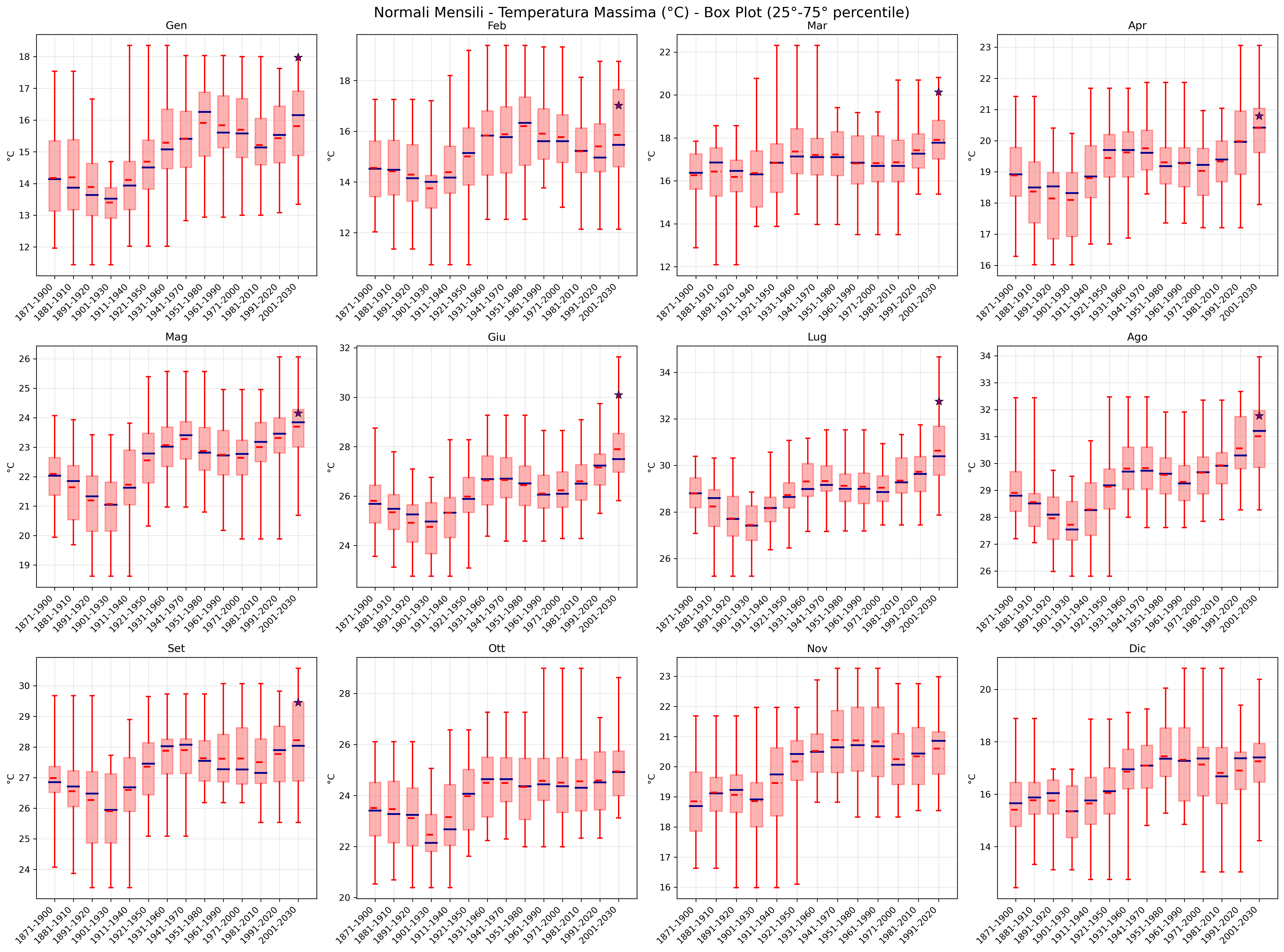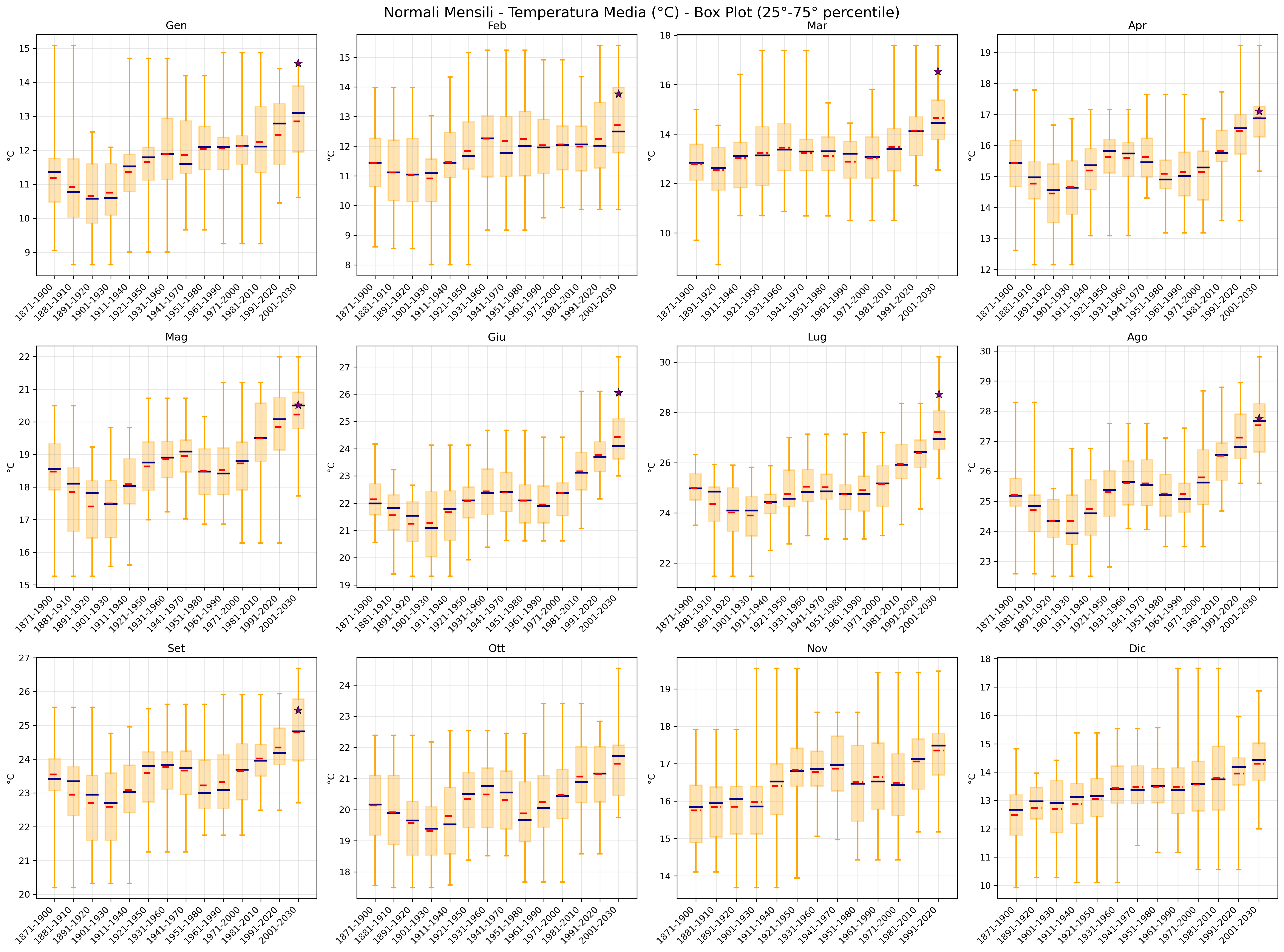 I seguenti grafici mostrano l'evoluzione dei normali climatici attraverso i diversi periodi trentennali dal 1871 fino ad oggi. Le stelle di colore scuro dentro l'ultimo trentennio marcano i valori medi mensili dell'anno in corso, per un rapido raffronto della situazione attuale con il clima del passato.