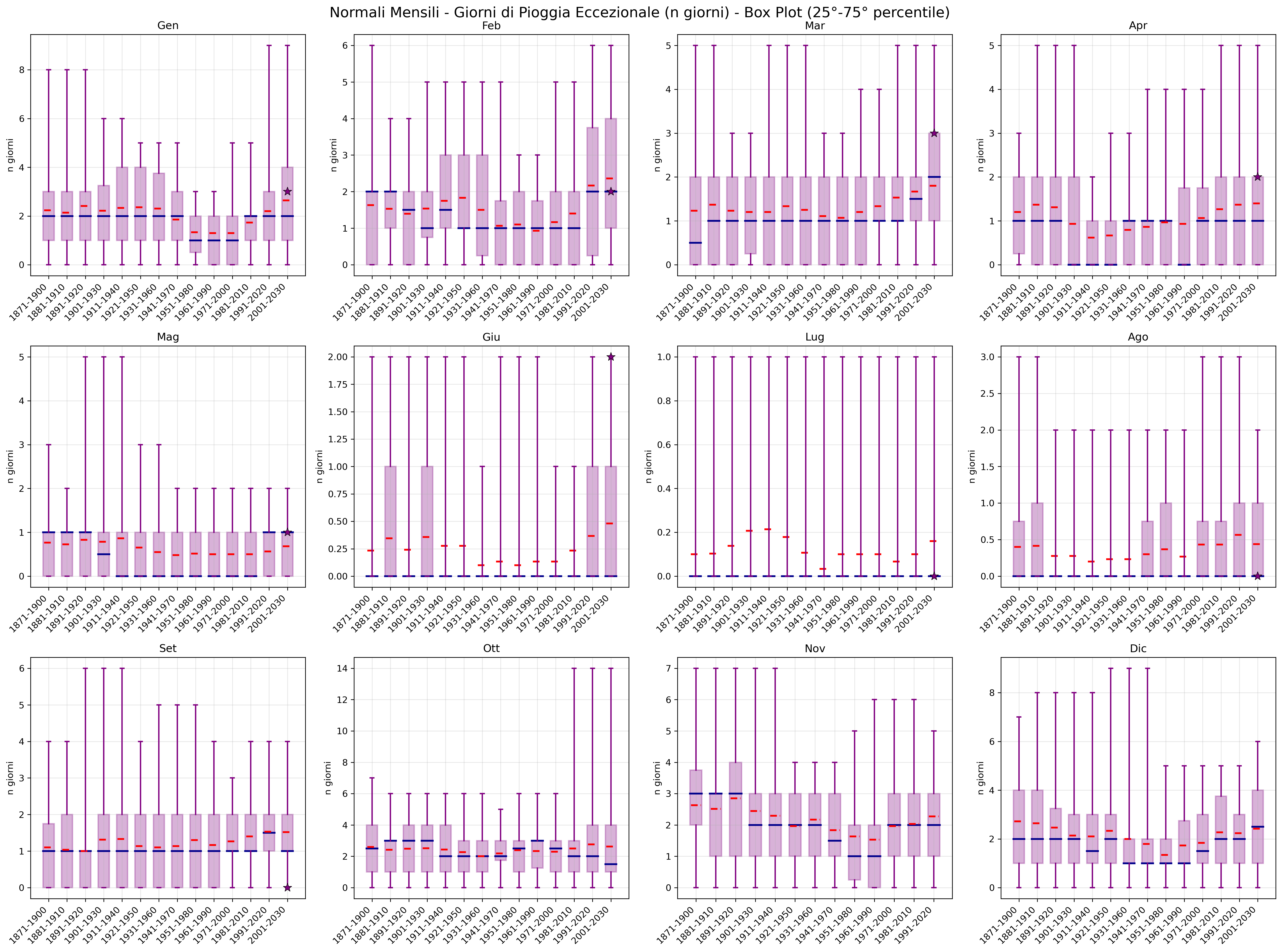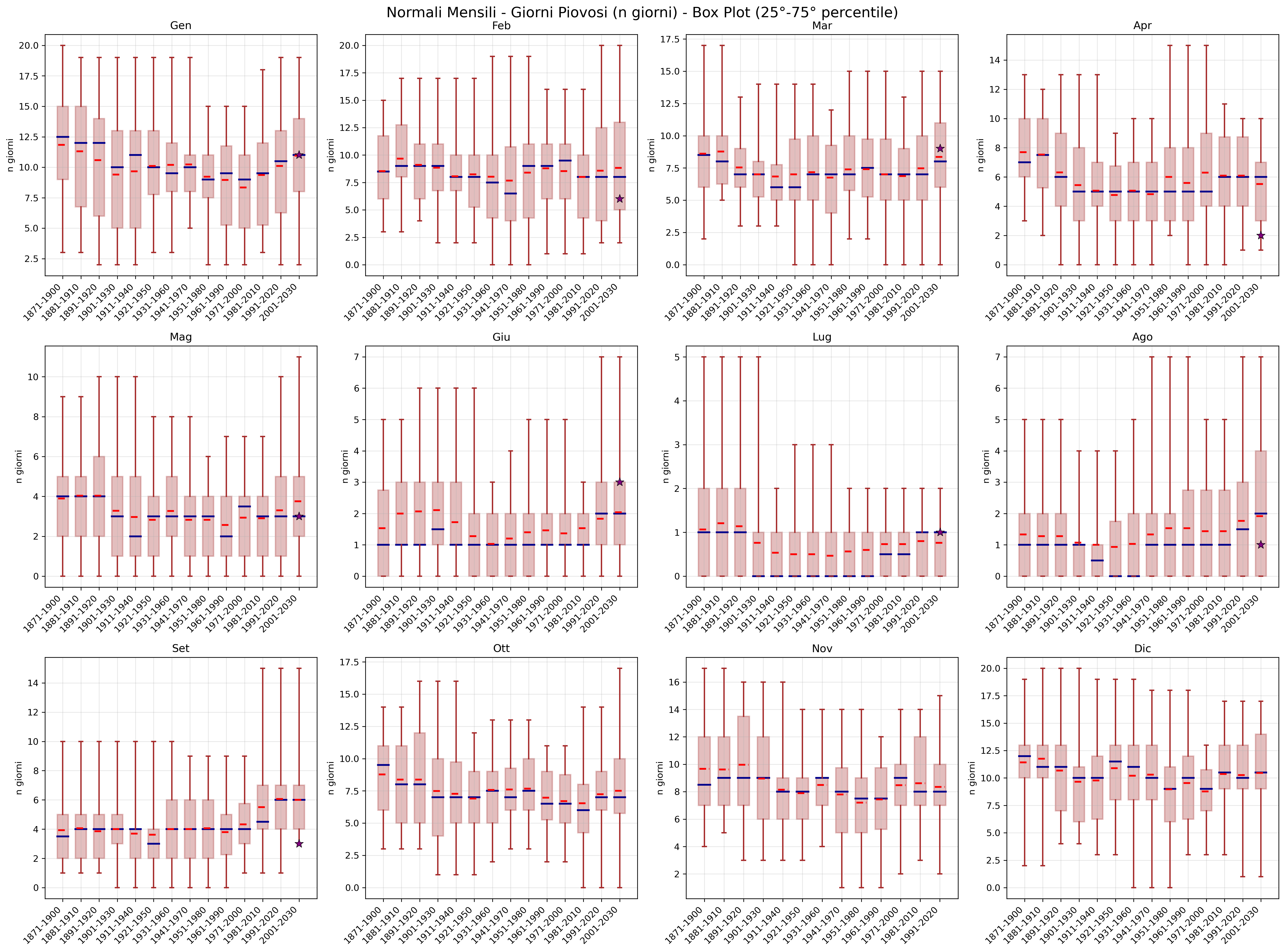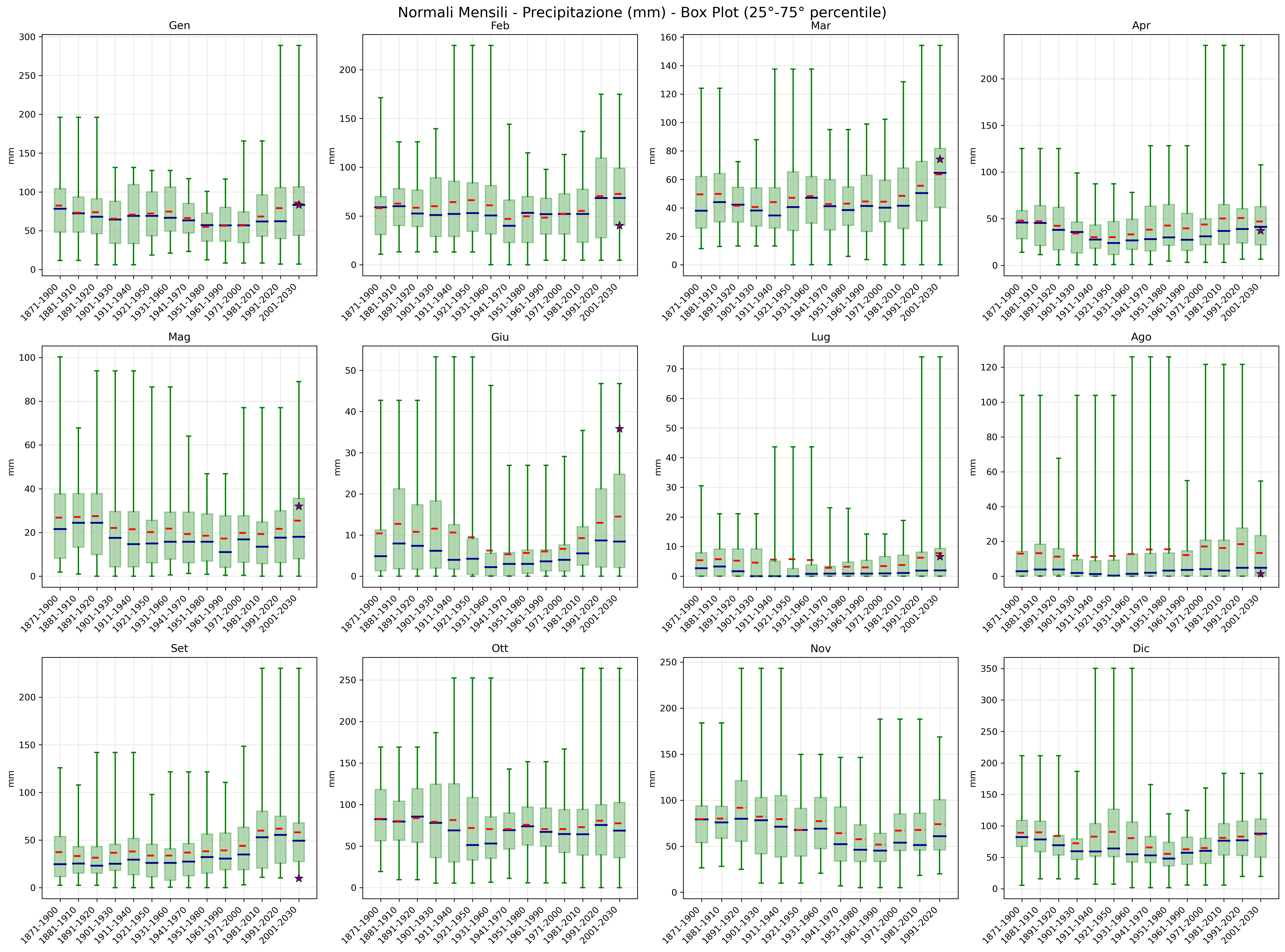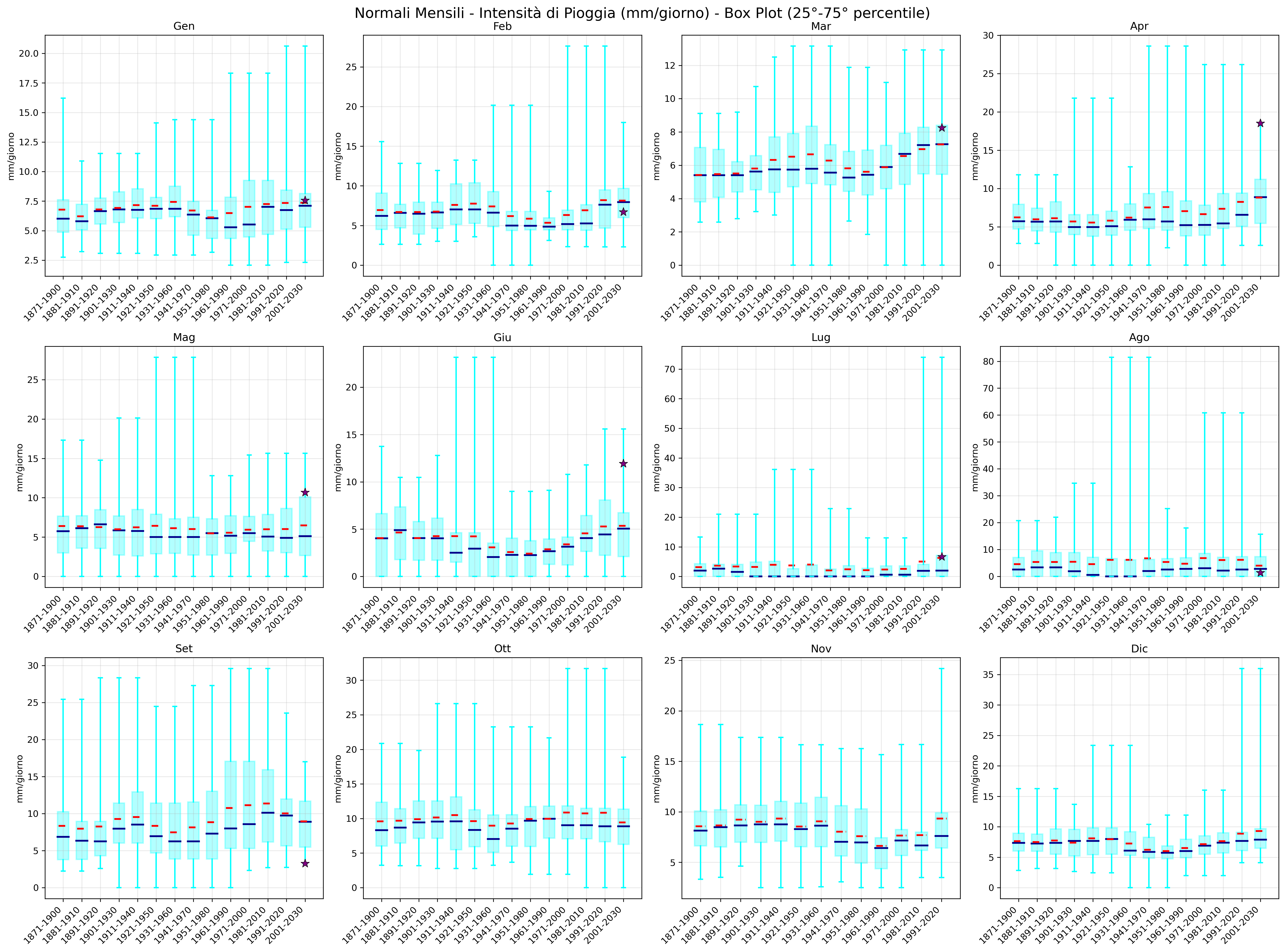 I seguenti grafici mostrano l'evoluzione dei normali climatici attraverso i diversi periodi trentennali dal 1871 fino ad oggi. Le stelle di colore scuro dentro l'ultimo trentennio marcano i valori medi mensili dell'anno in corso, per un rapido raffronto della situazione attuale con il clima del passato.
